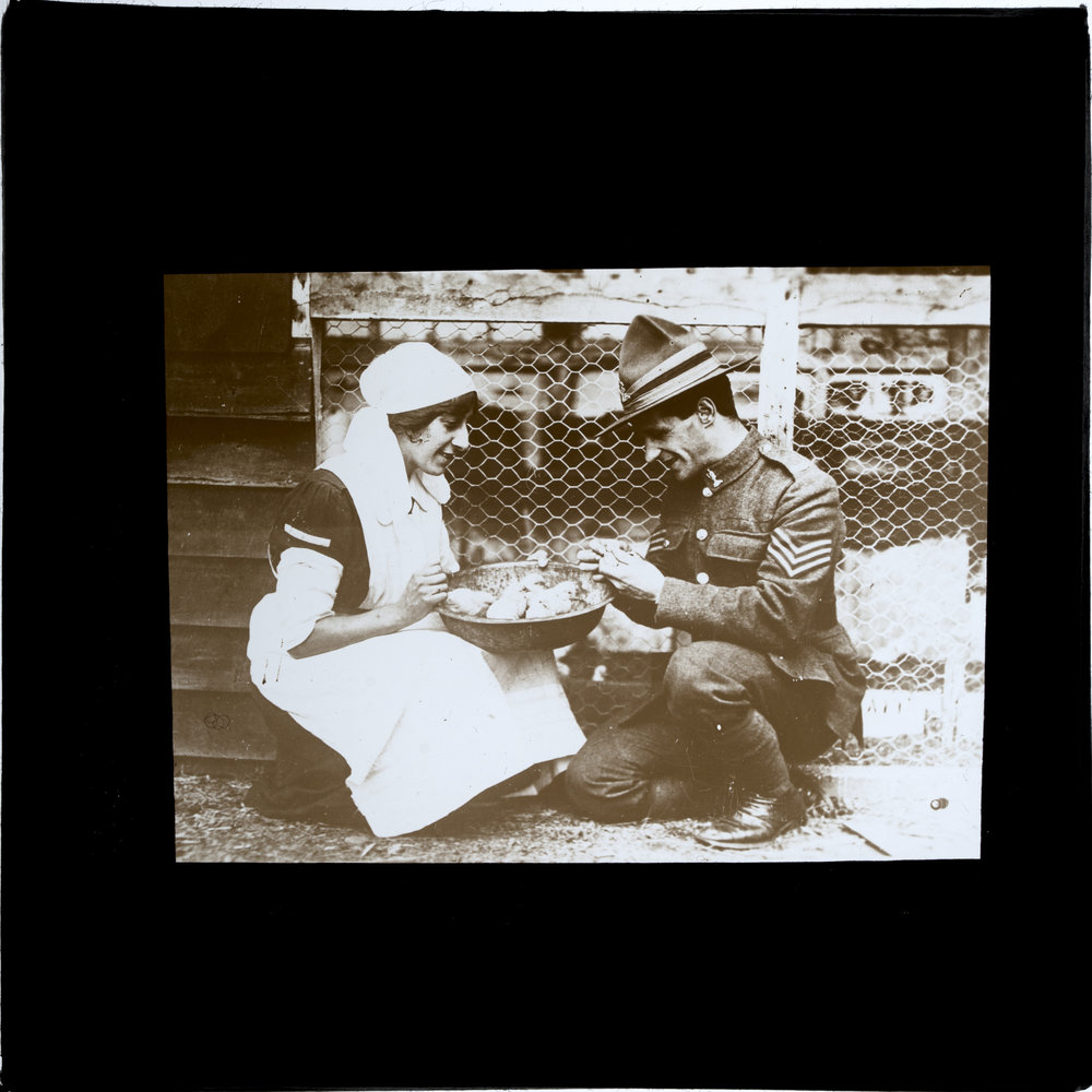 Soldier and woman looking at chicks, at Convalescent Hospital, Hornchurch ([c. 1914-c. 1919]). Pae Korokī, accessed 05/04/2026, https://paekoroki.tauranga.govt.nz/nodes/view/40067