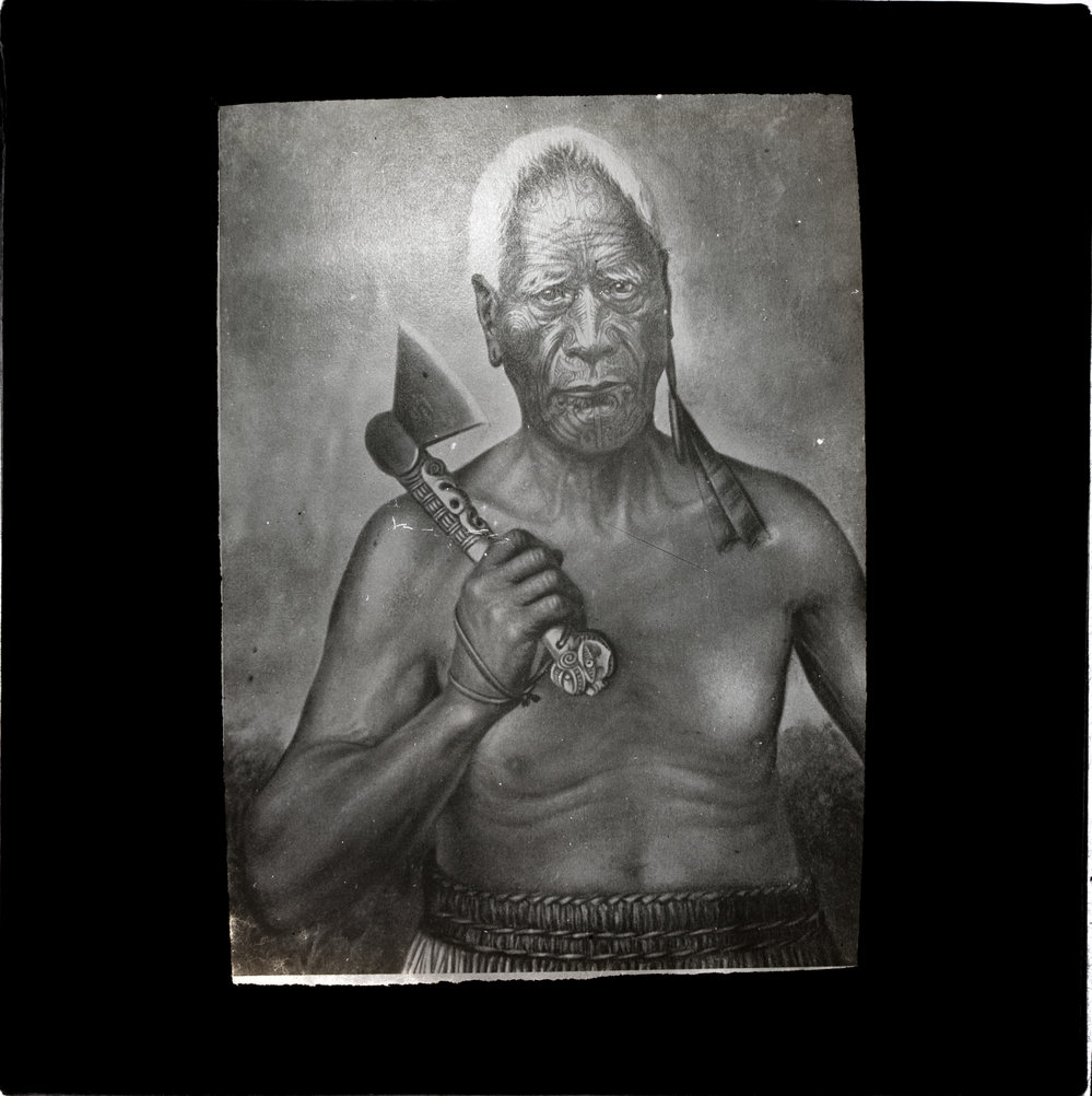 Painted portrait of Māori man with moko holding pātītī (hand axe) (copy photo)