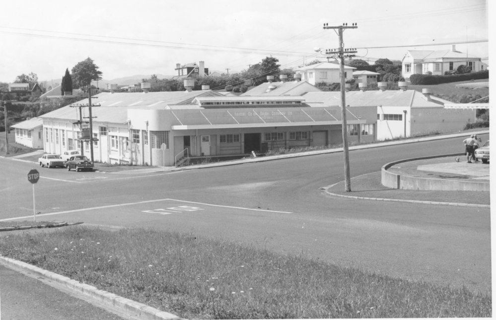 Date1969Reference NumberPhoto 99-942DescriptionDairy factory at the south east corner of Devonport Road, 11th Avenue intersection. 1969. Taken from further west, along 11th Avenue, showing particularly low level of site to surrounding land and houses and loading bay at factory. Source of AcquisitionTauranga District Council Photographer/CreatorRedwood Studios