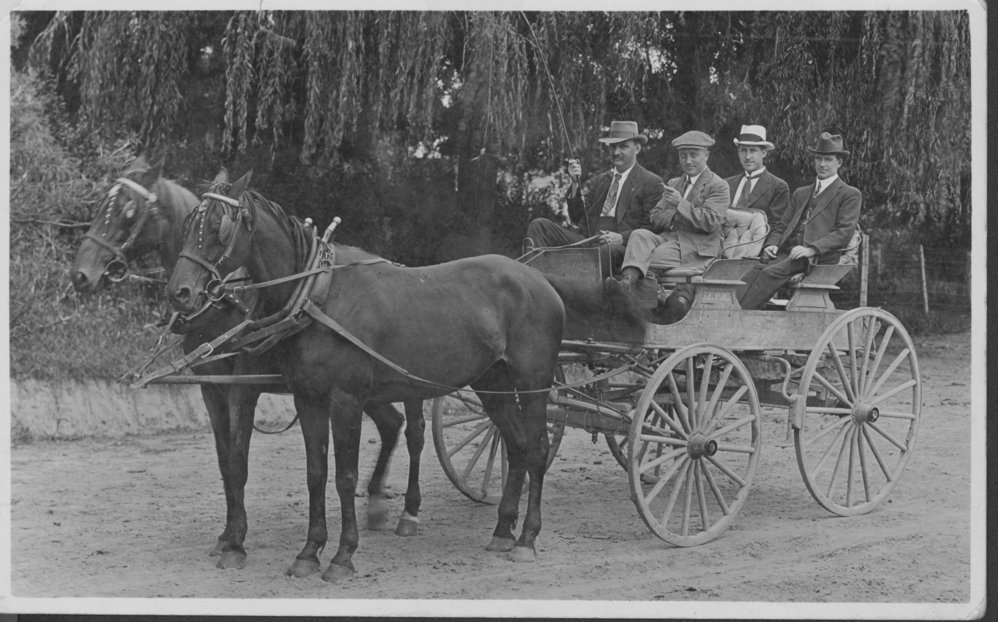 Date1910sReference NumberPhoto 99-966DescriptionMrs Singletons grandfather's buggy, Te Puke c. 1910s.FormatPrintPhysical Descriptionblack and white postcardSource of AcquisitionMrs Singleton & Mrs Taylor Photographer/CreatorWelsh, John, 1891-1964