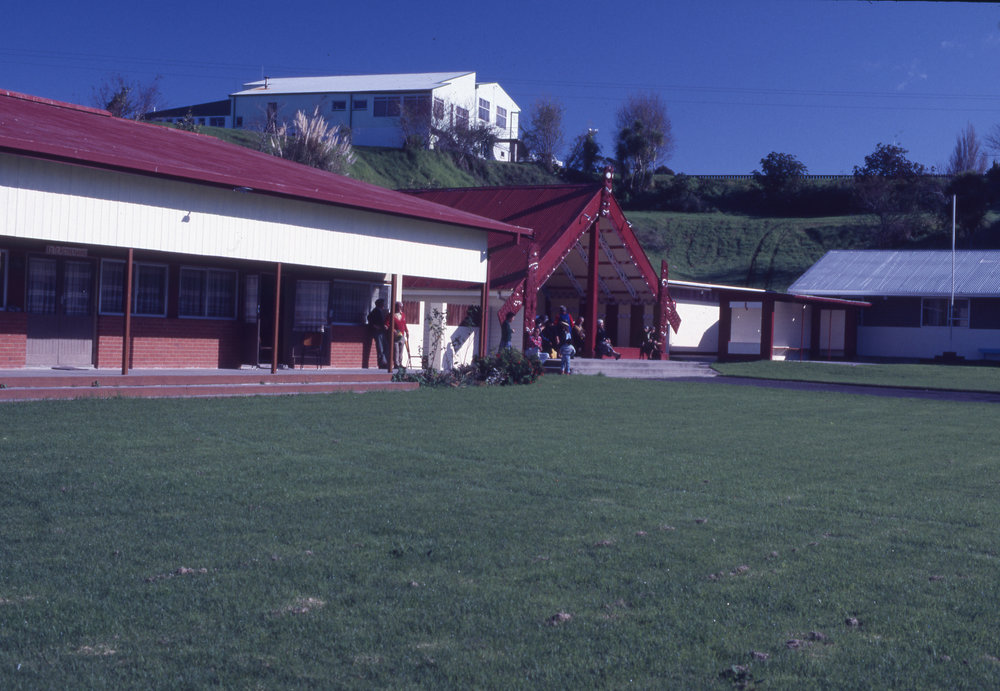 Date1988 to 1989Reference NumberPhoto 20-414DescriptionGroup of Opopoti (Maungatapu) descendants sitting infront of Wairakewa wharenui. Rangataua Sports and Cultural Club in the background on the hill. Image was not used in the Aku Taumata Korero - Ngā marae me ngā iwi o te moana o Tauranga book published in 1989.FormatPositivePhysical DescriptionPostive film image inside 50x50mm plastic slide film mount framePhotographer/CreatorBurch, Brad, 1948-2010