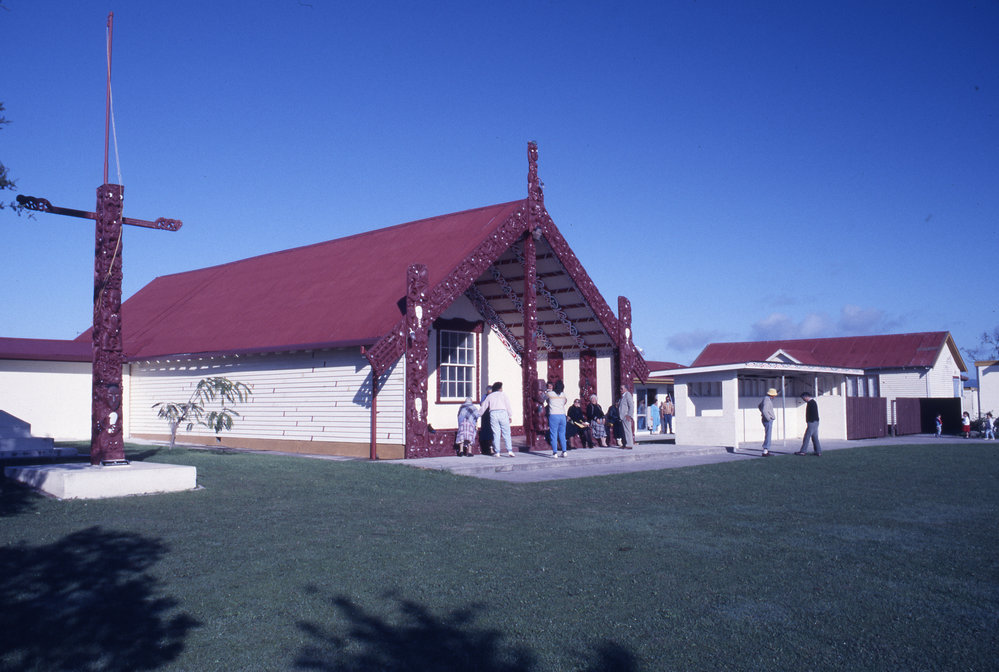 Date1988 to 1989Reference NumberPhoto 20-421DescriptionRanginui wharenui at Hairini marae. A group of descendants are gathered outside the wharenui. Image was not used in the Aku Taumata Korero - Ngā marae me ngā iwi o te moana o Tauranga book published in 1989.FormatPositivePhysical DescriptionPostive film image inside 50x50mm plastic slide film mount framePhotographer/CreatorBurch, Brad, 1948-2010