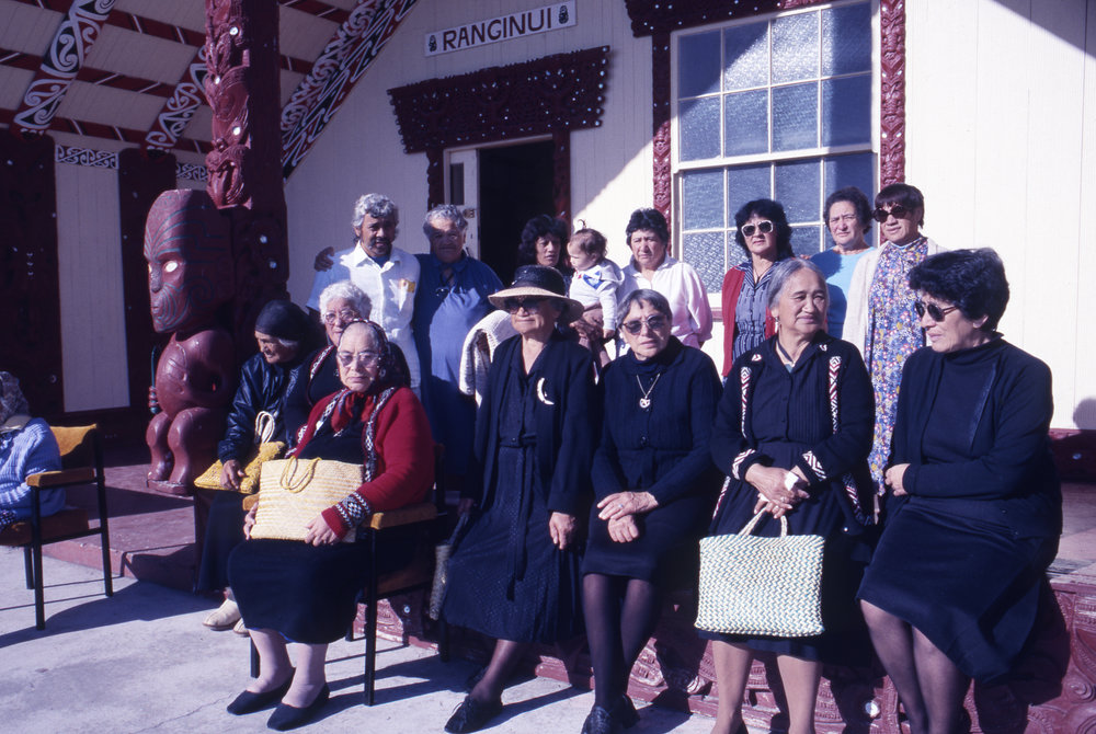 Date1988 to 1989Reference NumberPhoto 20-422DescriptionL to R (standing): Alfred Aubrey, ?, ?, ?, Lil Reweti, June Walker, ?; L to R (sitting): Tatai Blake (off the photo), Kimi Ngatai, Kini Reweti, Ra Keno, Ruihi Tawa, Sally Ririnui, Ruby Smith, Mihi Gardiner sitting infront of Ranginui wharenui. Image was not used in the Aku Taumata Korero - Ngā marae me ngā iwi o te moana o Tauranga book published in 1989. FormatPositivePhysical DescriptionPostive film image inside 50x50mm plastic slide film mount framePhotographer/CreatorBurch, Brad, 1948-2010