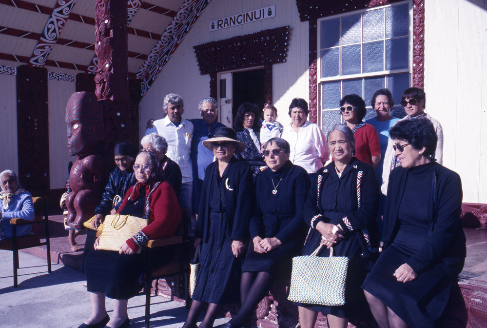 Date1988 to 1989Reference NumberPhoto 20-423DescriptionL to R (standing): Alfred Aubrey, ?, ?, ?, Lil Reweti, June Walker, ?; L to R (sitting): Tatai Blake (off the photo), Kimi Ngatai, Kini Reweti, Ra Keno, Ruihi Tawa, Sally Ririnui, Ruby Smith, Mihi Gardiner sitting infront of Ranginui wharenui. Image was not used in the Aku Taumata Korero - Ngā marae me ngā iwi o te moana o Tauranga book published in 1989. FormatPositivePhysical DescriptionPostive film image inside 50x50mm plastic slide film mount framePhotographer/CreatorBurch, Brad, 1948-2010