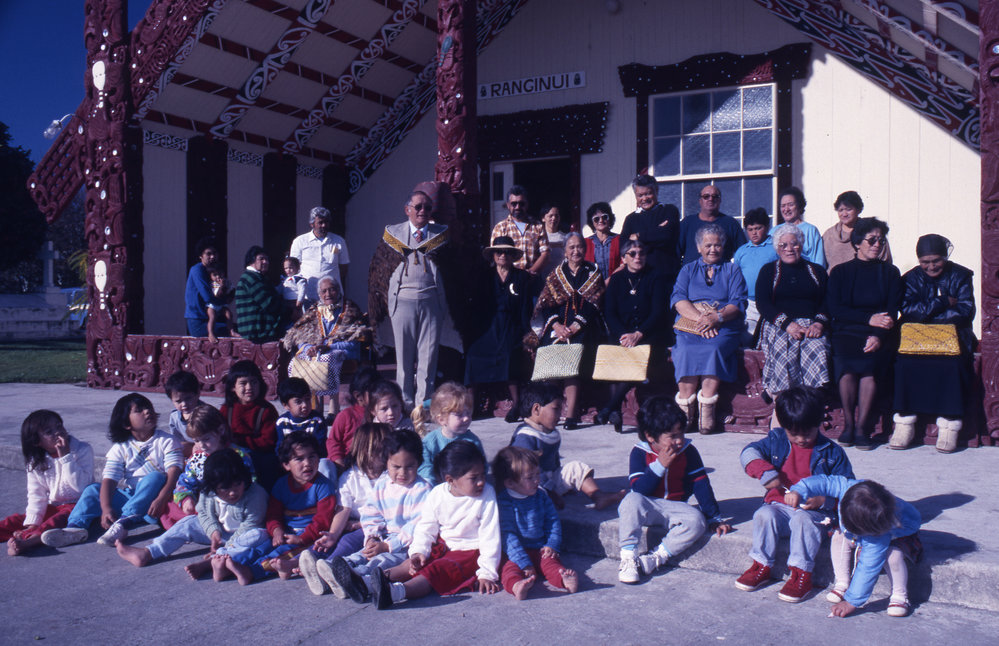 Date1988 to 1989Reference NumberPhoto 20-425DescriptionL to R (adults standing): Alfred Aubrey, Paraone Reweti, Huikakahu Kawe, Margaret Mc Leod, Lil Reweti, Rennie Ormsby, JJ Reihana, Tāhere, June Walker, Kapu Muru; L to R (adults sitting): ? (and child unknown), Kiriwai Poroa (baby unknown), Tatai Blake, Ruihi Tawa, Ruby Smith, Sally Ririnui, Bunny Ririnui, Kini Reweti, Mihi Gardiner, Kimi Ngatai; L to R (children sitting on step); Matutaera Ririnui, Hollie Stokes, Elijah Kingi, ?, Tiaho Fairhall, ?, Basil Tai, Paora Gardiner, Te Mana Smith, ? sitting infront of Ranginui wharenui. The children sitting are from Te Kohanga Reo at the marae. Image was not used in the Aku Taumata Korero - Ngā marae me ngā iwi o te moana o Tauranga book published in 1989. FormatPositivePhysical DescriptionPostive film image inside 50x50mm plastic slide film mount framePhotographer/CreatorBurch, Brad, 1948-2010