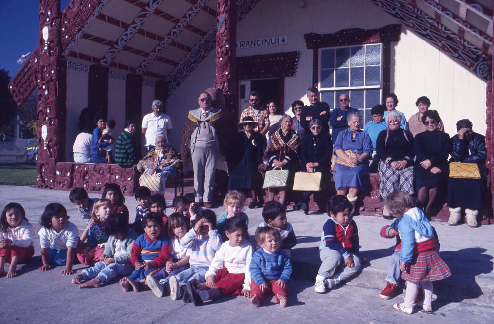 Date1988 to 1989Reference NumberPhoto 20-426DescriptionL to R (adults standing): Alfred Aubrey, Paraone Reweti, Huikakahu Kawe, Margaret Mc Leod, Lil Reweti, Rennie Ormsby, JJ Reihana, Tāhere, June Walker, Kapu Muru; L to R (adults sitting): ?, ? (and child unknown), Kiriwai Poroa, Tatai Blake, Ruihi Tawa, Ruby Smith, Sally Ririnui, Bunny Ririnui, Kini Reweti, Mihi Gardiner, Kimi Ngatai; L to R (children sitting on step); Matutaera Ririnui, Hollie Stokes, Elijah Kingi, ?, Tiaho Fairhall, ?, Basil Tai, Paora Gardiner, Te Mana Smith, ? sitting infront of Ranginui wharenui. The children sitting are from Te Kohanga Reo at the marae. Image was not used in the Aku Taumata Korero - Ngā marae me ngā iwi o te moana o Tauranga book published in 1989. FormatPositivePhysical DescriptionPostive film image inside 50x50mm plastic slide film mount framePhotographer/CreatorBurch, Brad, 1948-2010
