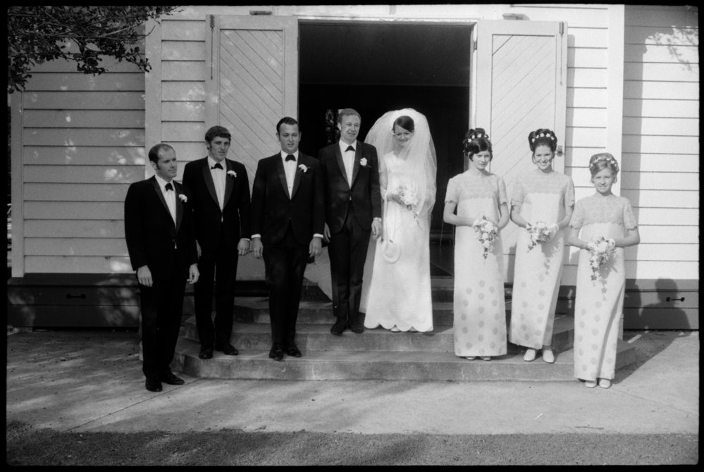 Date30 May 1970Reference NumberPhoto pn-7650DescriptionTaylor-Kenyon wedding : Betty Kenyon (of Darraghs Road) to Doug Taylor with attendants, Faye Gilmore, Sue Harrison, Diane Taylor, Phil Kenyon, Stuart Doyle & Michael Henderson. Photograph taken for magazine number 96 of the Bay of Plenty Photo News, 30 May 1970, p.9.FormatNegativePhysical Description35mm negative