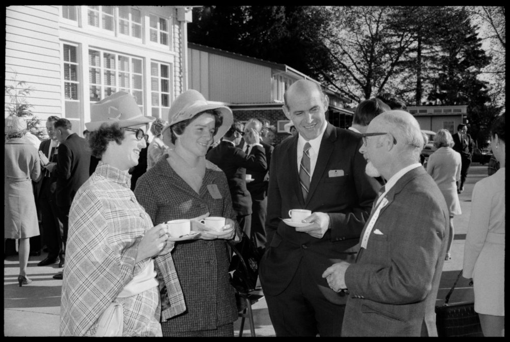 Date27 June 1970Reference NumberPhoto pn-7864DescriptionJubilee Time : Geojeane Cosh, Patricia Brooks, Len Cosh & George Wilkinson at a Sunday afternoon tea party celebrating Tauranga Boys' College 25th birthday. Photograph taken for magazine number 97 of the Bay of Plenty Photo News, 27 June 1970, p.10.FormatNegativePhysical Description35mm negative