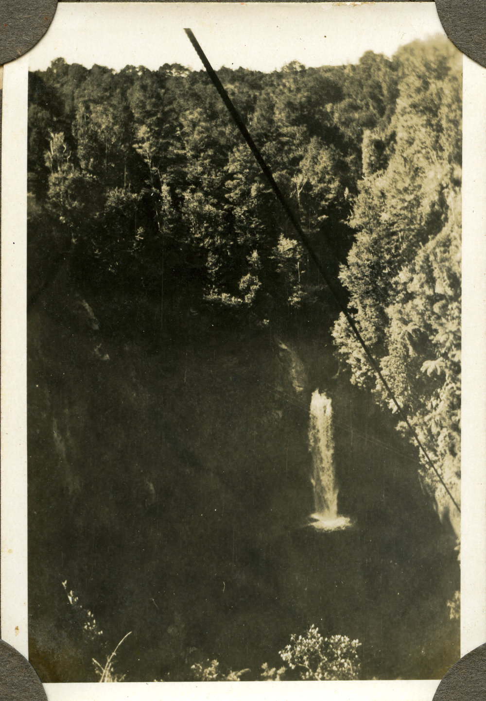 Date1929-1930Reference NumberPhoto 11-086DescriptionOmanawa Falls, Dec 1929 or Jan 1930. From an album of photos taken by George James Strickett, engineer, of Ōtāhuhu, who was visiting relations in Tauranga over the summer of 1929-1930. He rode his 1927 AJS motorbike on fascined roads. FormatPrintPhysical Descriptionblack and white printPhotographer/CreatorGeorge James Strickett