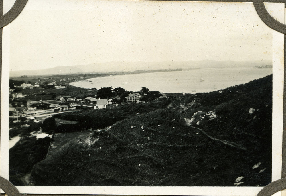 Date1929-1930Reference NumberPhoto 11-091DescriptionPilot Bay from Mauao looking south over Mount Maunganui township, Dec 1929 or Jan 1930. From an album of photos taken by George James Strickett, engineer, of Ōtāhuhu, who was visiting relations in Tauranga over the summer of 1929-1930. He rode his 1927 AJS motorbike on fascined roads. FormatPrintPhysical Descriptionblack and white printPhotographer/CreatorGeorge James Strickett