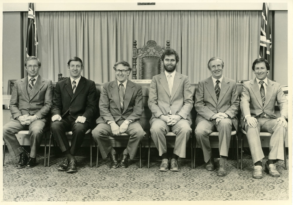 Date1982Reference NumberPhoto 09-119DescriptionDepartment heads, Tauranga City Council, 1982. Left to right: W. E. (Bill) Turner (Parks and Recreation); P. M. R. Browne (Electrical Engineer); Keith T. Dee (Engineer); Merv. C. Montacute (City Manager); E. P. Jones (City Secretary); A. J. Hayes (City Treasurer). FormatPrintPhotographer/CreatorRenwood Studio Tauranga