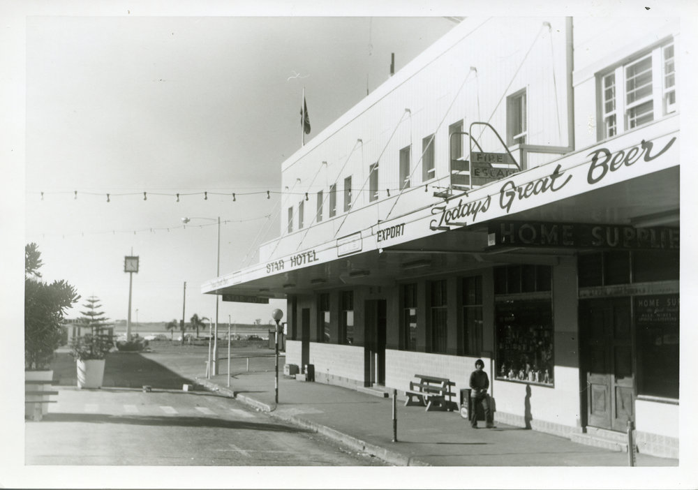 Date1974Reference NumberPhoto 10-016DescriptionStar Hotel, corner Spring Street and Devonport Road, Tauranga. Photo taken looking towards harbour and clock. 1974. FormatPrintPhysical Descriptionblack and white print