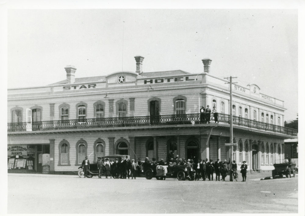 Datec. 1915 to c. 1920Reference NumberPhoto 10-040DescriptionStar Hotel, Tauranga, c 1915-1920 (after extensions completed in 1913; Robbins - land agent in office on left - was mayor 1912-1915.) Service cars outside hotel. FormatPrintPhysical Descriptionblack and white print