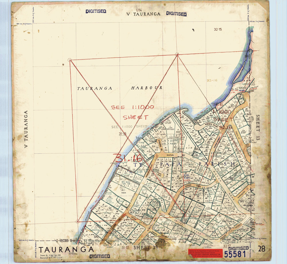 Land Information New Zealand (LINZ), Tile 28: Survey Office map 55581. Pae Korokī, accessed 27/03/2026, https://paekoroki.tauranga.govt.nz/nodes/view/43718