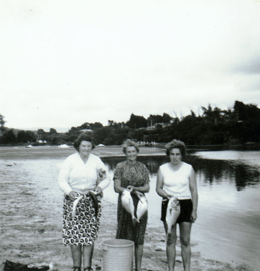 DateEarly 1960sReference NumberPhoto 05-421DescriptionWomen with fish, Holmes Holiday Haven, Te Puna, on the shores of Tauranga harbour; early 1960s.FormatPrintPhysical Descriptionblack and white print