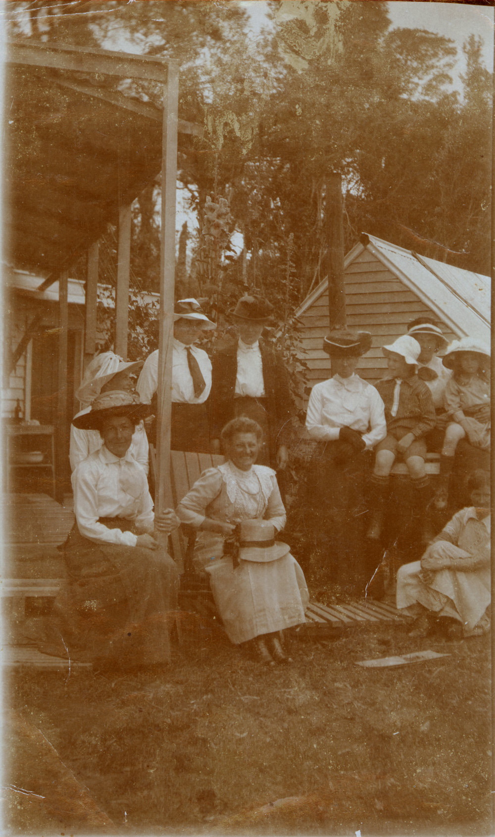 Datec.1910sReference NumberPhoto 05-558DescriptionGroup of people at Whakamārama, c. 1910s. Granny Nell (Mrs G. F. Nell) seated centre.FormatPrintPhysical Descriptionblack and white print