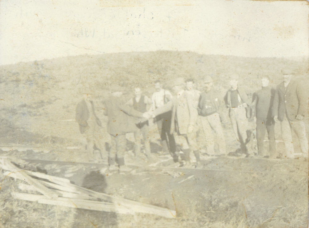 Datec.1910sReference NumberPhoto 05-564DescriptionAt Whakamārama mill: H. H. Sharplin on left shaking hands with line contractor J. Peterson. Left to right: J. Dooley, B. Brister, J. Haughey, P. Newdick, G. F. Nell, H. Sharplin, A. Sharplin, C. T. Ormsby.FormatPrintPhysical Descriptionblack and white print