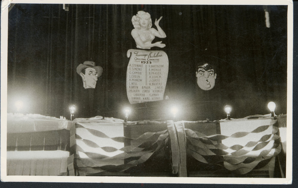 Datec. 1949Reference NumberPhoto 06-267DescriptionBachelors' Ball in Tauranga Town Hall, c. 1949. Scroll lists the Original committee of 1925. Polished floor with a motorbike and a sack filled with sawdust. [Printed on back: BRUCE MOUAT, 91 CAMERON ROAD, TAURANGA, NZ. to re order quote No. above]FormatPrintPhysical Descriptionblack and white printPhotographer/CreatorMouat, Bruce