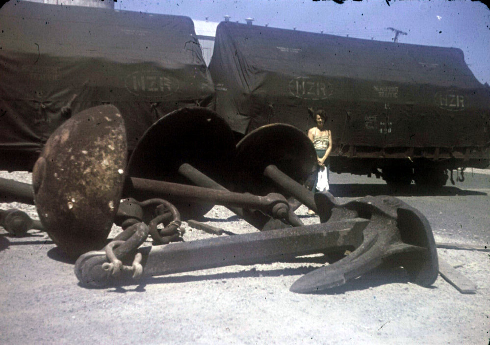 Date1960sReference NumberPhoto 06-491DescriptionYoung woman standing in front of NZR railway wagons, with large anchor and other large pieces of industrial metal, probably at Port of Tauranga, 1960s. AutoColor used.FormatPrintPhysical Descriptioncol slide