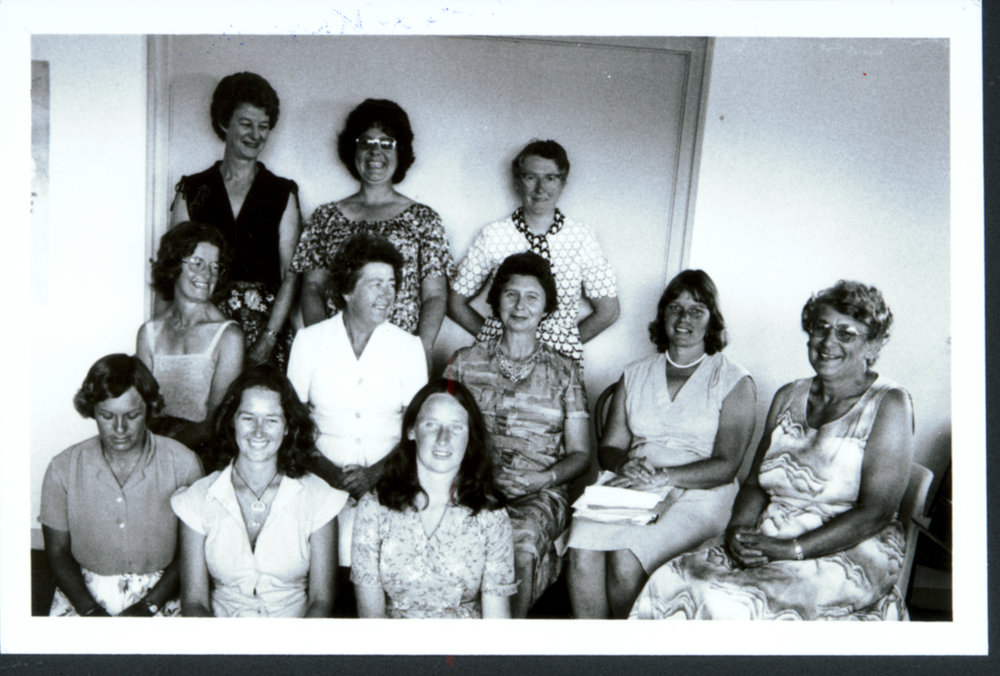 Datec. 1980Reference NumberPhoto 07-240DescriptionTauranga Women's Refuge Committee of Management, c 1980. Photo removed from ("Research notes of Derdre Kent"). Back: Nancy Baird, Anne Hyde, Betty Owiein. Middle: Pat Earnshaw, Val Dobson, Nora Reid, Sharon Lawrie, Joy Drayton. Front: Prue Debreceny, Chris Grove, Win McDonald. FormatPrintPhysical Descriptionblack and white print