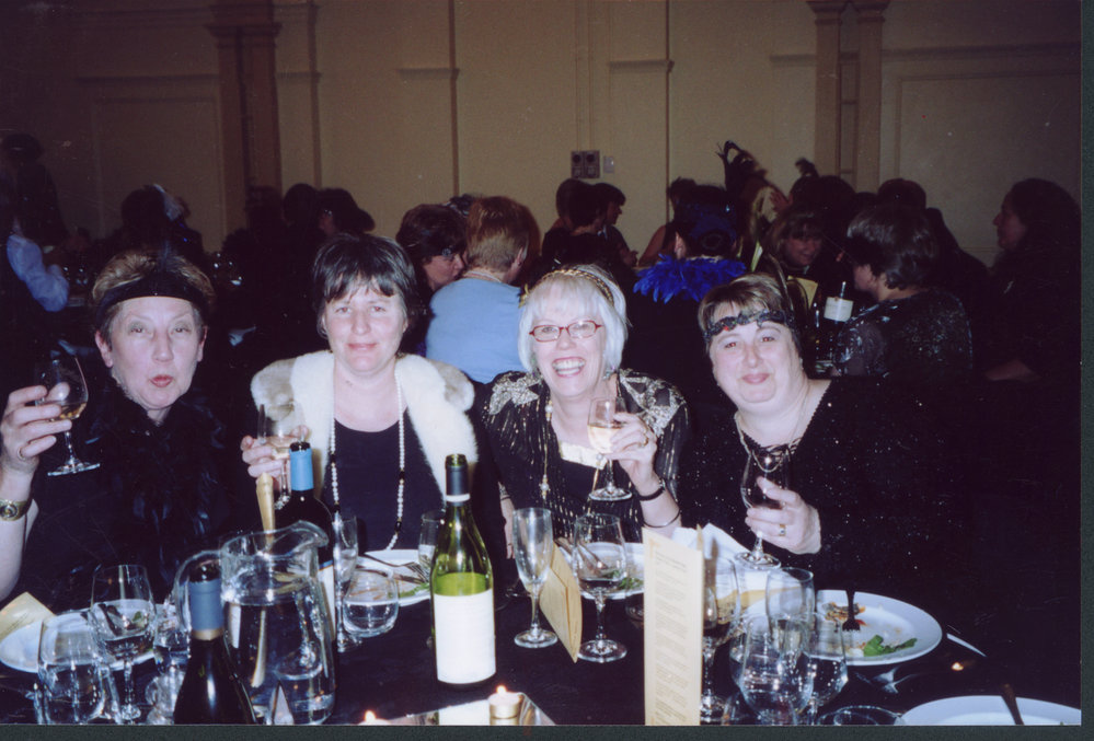 DateOctober 2003Reference NumberPhoto 07-278DescriptionTauranga librarians in Art Deco costume at LIANZA conference dinner in Napier, October 2003. Left to right, Judy Sail, Lee Rowe, Diane Taggart, Creena Brungar.FormatPrintPhysical Descriptioncoloured printPhotographer/CreatorTulloch, Bob