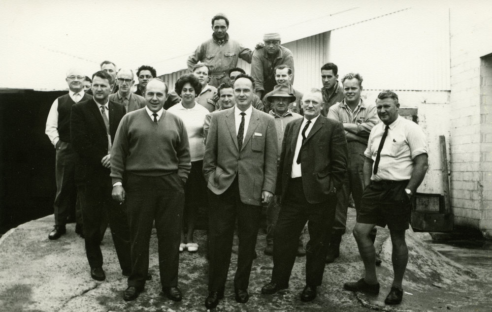 Datec. 1970sReference NumberPhoto 11-158DescriptionSanfords, Sulphur Point Depot, Tauranga c. 1970s. Front left; from man in dark suit - Doug Edwards (Edwards Engineering), Jack Costello, unknown, unknown, Roy Edwards with sleeves rolled up (Edwards Engineering). Also in photo; Vince Crossman, Eric Smith (unloading foreman), Dave and Frank Holloway.FormatPrint