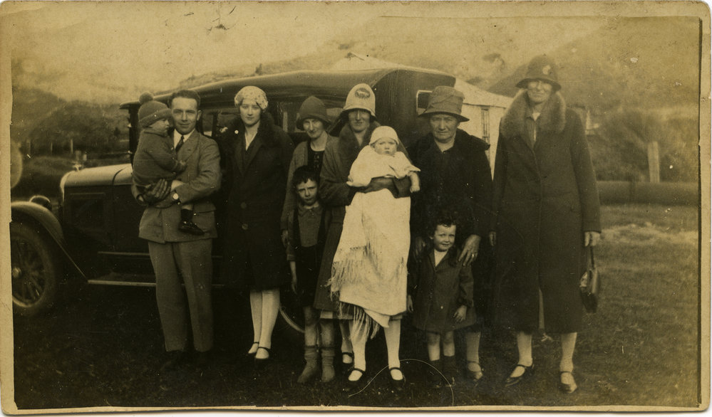 Datec. 1920sReference NumberPhoto 12-021DescriptionFamily group in front of Frank Bickers' car, Komata?, c. 1920s. L to R: Mick Bickers, Frank Bickers, unnamed, Una Pennell nee Simpson with Gordon, Ivy Millar nee Simpson with Max?, Sarah Bickers with Bobbie, Emma Simpson.FormatPrintPhysical Descriptionblack and white print