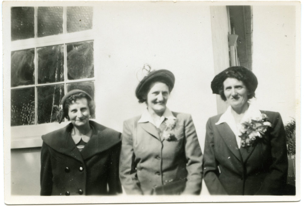 Datec. 1950sReference NumberPhoto 12-203DescriptionThe Simpson sisters, c. 1950s. L to R: Una (Pennell), Gwen (Patterson), Ivy (Millar). Possibly at a wedding. Ivy Millar is wearing a maroon suit.FormatPrintPhysical Descriptionblack and white print