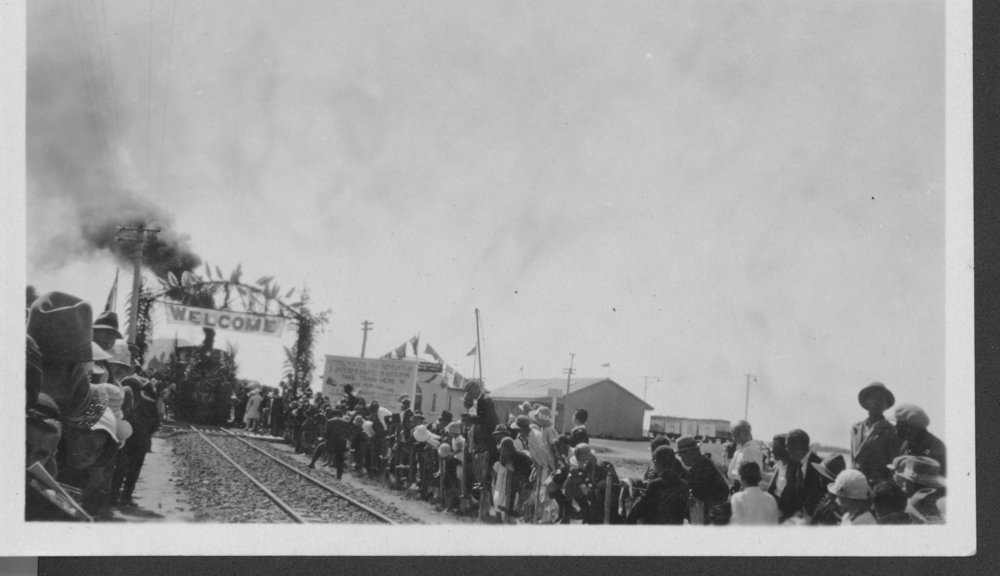 DateMarch 1928Reference NumberPhoto 99-964DescriptionPhoto of the first train to Tāneatua passing through Te Puke, March 1928. Passing under an arch decorated with ferns and toetoe fronds, holding a banner saying Welcome. Next to a sign reading "Passengers to Tāneatua & intermediate stations take train here. Patronize your own line". Crowd lines either side of the track.FormatPrintPhysical Descriptionblack and white rpint