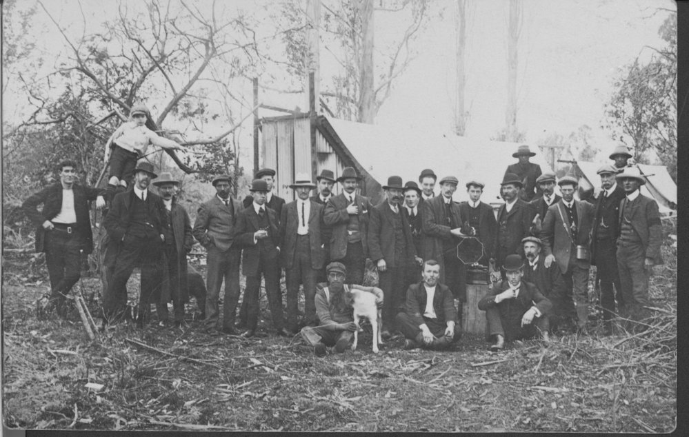 Datec. 1910Reference NumberPhoto 99-978DescriptionTwenty-five men standing in front of tents - the largest with a corrugated iron end - in partly-cleared bush. Mostly in suit and tie, only two are hatless. 3-4 are Māori. One boy perched in a tree holding an axe. One man in an overcoat is holding a largish bird above a phonograph, which is sitting on a round of timber. Originally described as railway survey camp at Whareroa.FormatPrintPhysical Descriptionblack and white print