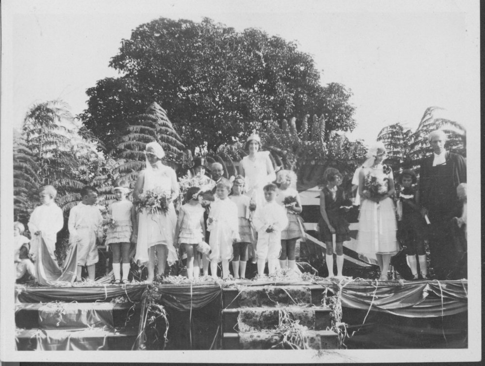 Date1931Reference NumberPhoto 99-987DescriptionOriginally described as: Queen Carnival at Te Puke to raise funds for the swimming baths, 1931. Mavis Kerr is in centre (runner-up in early Miss New Zealand competition). Three winners (?) are on a stage backed by a Union Jack and fern fronds, accompanied by ten boys and girls in page outfits, an older man and woman in the background and a man in lawyers robes and wig (the judge?).FormatPrintPhysical Descriptionsepia print