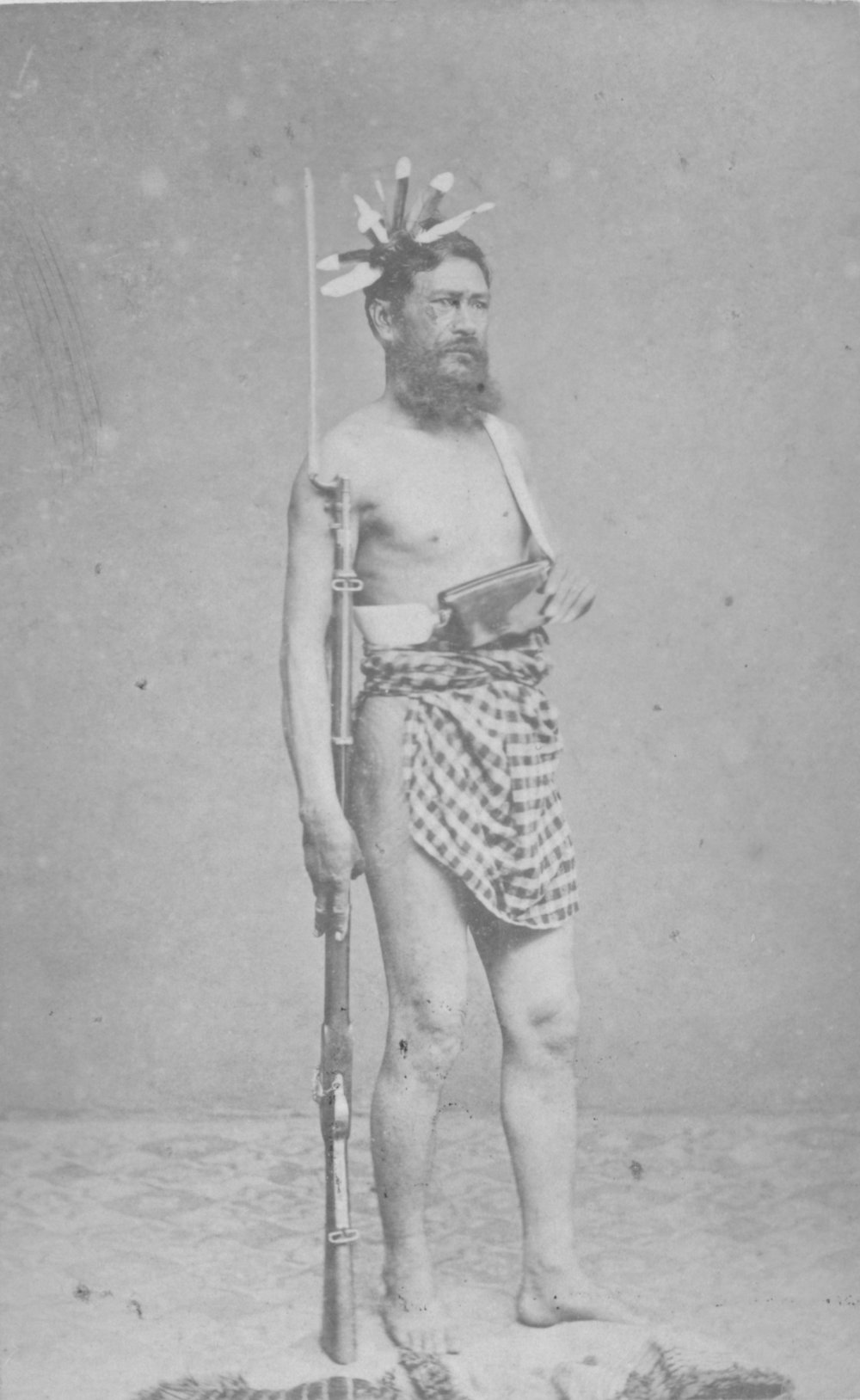 Reference Number1972.0291DescriptionStudio portrait photograph of a maori man, with a checked cloth tied around his waist, feathers in his hair, and a rifle in his right hand. On the reverse of the photograph is printed: "Photographed by - H. WEBSTER - AUCKLAND", and written in pencil above this: "Hamiora Tu - guide to troops with Raniera Te Hiahia died 1879 - grandfather of Hamiora Tu (Robby)". There is an A.N. BROWN COLLECTION stamp on the reverse.Physical DescriptionDocumentary Artifact. Carte-de-visite. Dimensions are taken to the outside of the card.. Printsize: 105 x 62mmPhotographer/CreatorWEBSTER, H.