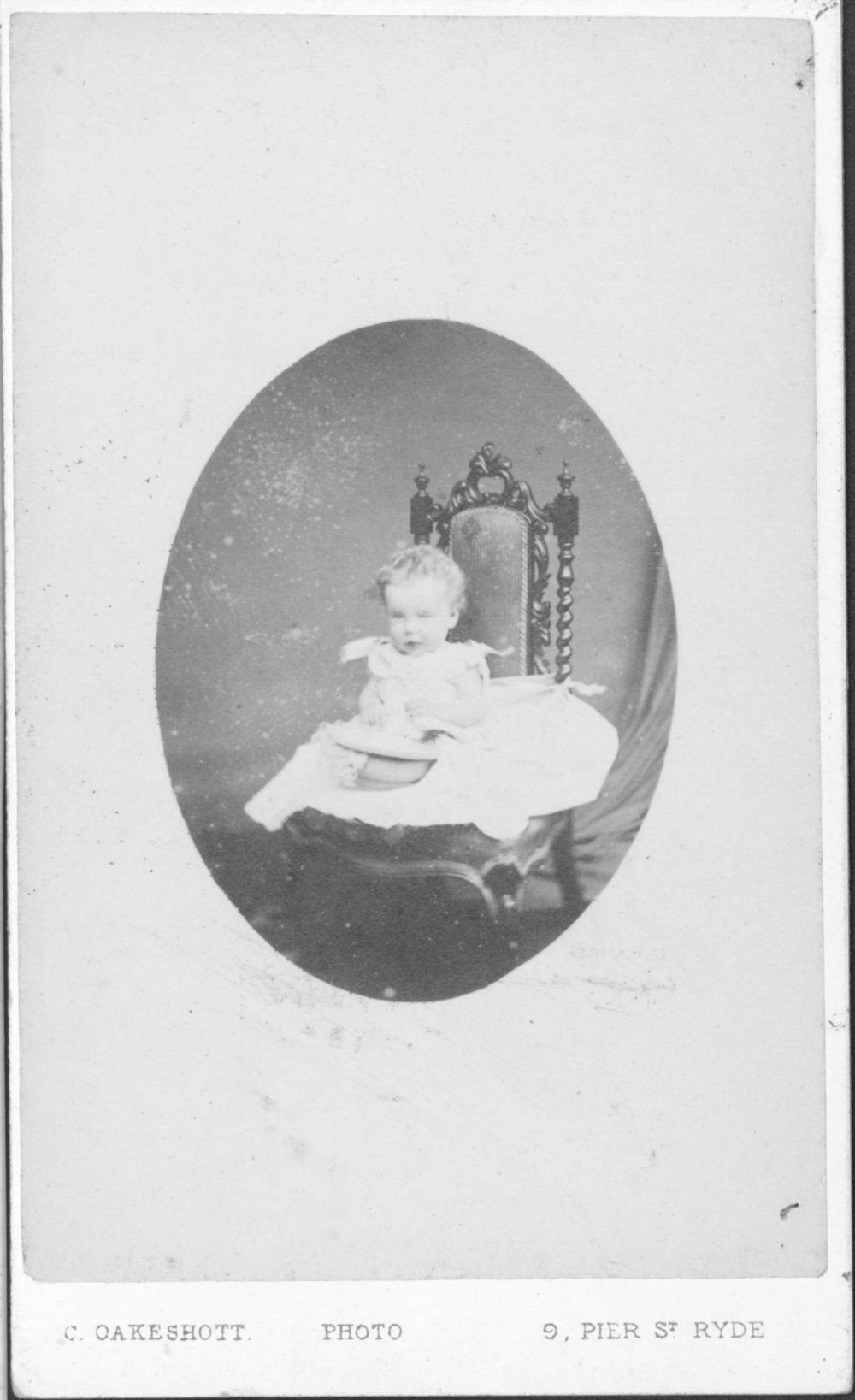Reference Number1972.0316DescriptionPortrait photograph of a young child, seated on a carved wooden chair. The photograph is black and white with sepia tones, and the image is an oval shaped panel in the centre of an outer cream coloured border on the photographic print itself. The photograph is mounted on a card and printed in red on the white border below the photograph is: "C. OAKESHOTT PHOTO - 9. PIER ST. RYDE.". Written in black felt pen on the reverse of the card is: "Harry Palmer 1 year old", and printed in red below this: "C. OAKESHOTT - PHOTOGRAPHER - 3 Pier Street - RYDE. I.W.." There is an A.N. Brown stamp below this.Physical DescriptionDocumentary Artifact. Carte-de-visite. Measurements are taken to outside of card.. Printsize: 105 x 62mmPhotographer/CreatorOAKESHOTT, C.