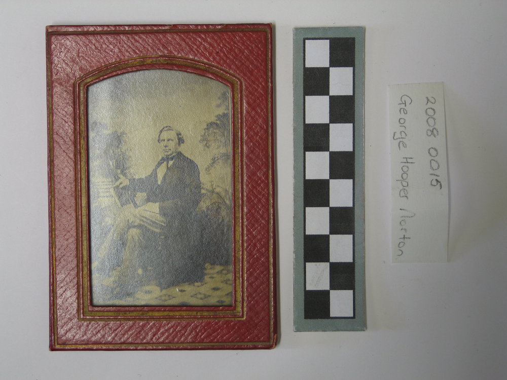 Reference Number2008.0015DescriptionA leather pocket sized frame with photograph, (one of a pair). The frame is made from a fine leather stained red with gilt decoration, and the photograph slides inside it, with a glass window over it. The photograph is a studio portrait of a man seated in a carved wooden chair holding a book. The photograph is taken in the same studio as the one of his wife Mary Ellis Jefferies, taken by Miss. Cumber, Artist Photographer of Guernsey. There is a note included with this item written in Miss. G. Nevell's hand: "My Grandfather NORTON ( George Hooper), my mother's father and his wife, my Grandmother. ? Mary Ellis Jefferies".. Although not recorded in The Elms Trust receipt book, it is likely this item was donated by Miss. G. Nevell the Grand daughter of Captain William Nevell, as George Hooper Norton was her Grandfather.. Noted with file: These two pictures are a matching pair, husband and wife.Physical DescriptionArt. Picture