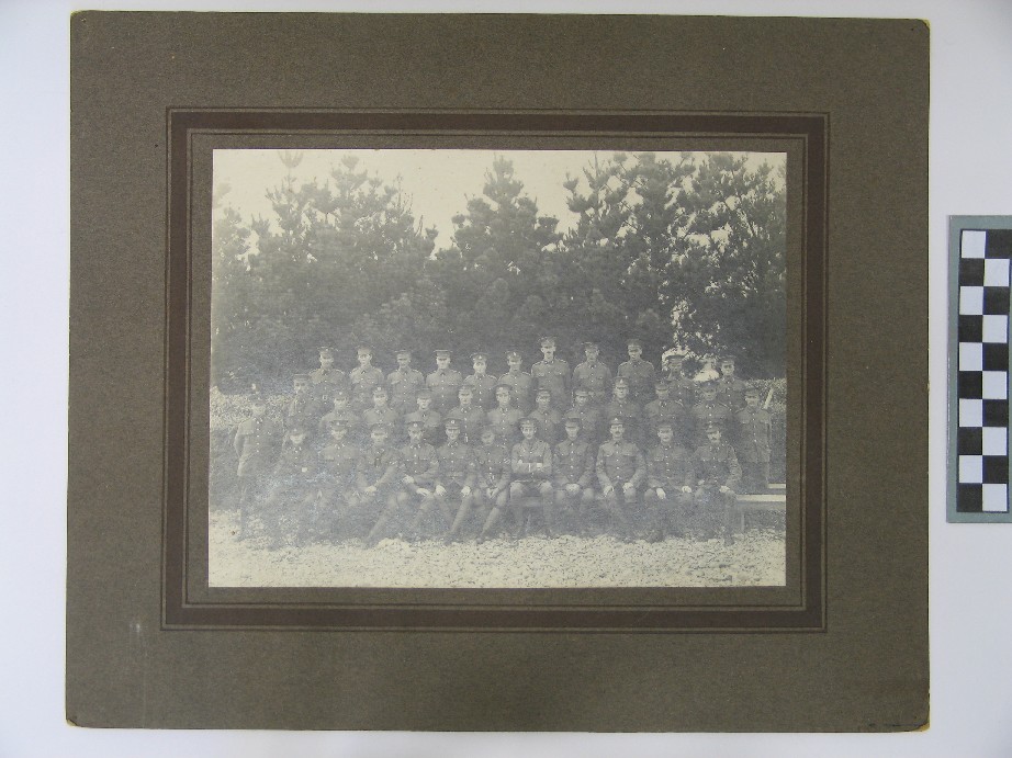 Reference Number2008.0439DescriptionA photograph mounted on a brown card backing, of a group of soldiers. The 35 soldiers are wearing puttees, and appear to be c. WW1. Stamped on the back of the card is: "D.H. Maxwell - No."Physical DescriptionDocumentary Artifact. Print, Photographic