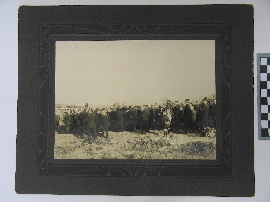 Reference Number2008.0445DescriptionA photograph mounted on a piece of grey card backing, of a funeral. The card has a design embossed onto it, forming a decorative border around the photograph. The scene is of a crowd around the grave, and there is a gun salute being fired. On the back of the card is stamped: "R.W. Meers, Photo, Tauranga". There is a sheet of lined paper that has been glued onto the back of the card.. Noted with file: These 3 photographs appear to be of the same funeral.Physical DescriptionDocumentary Artifact. Print, PhotographicPhotographer/CreatorMEERS, R.W.