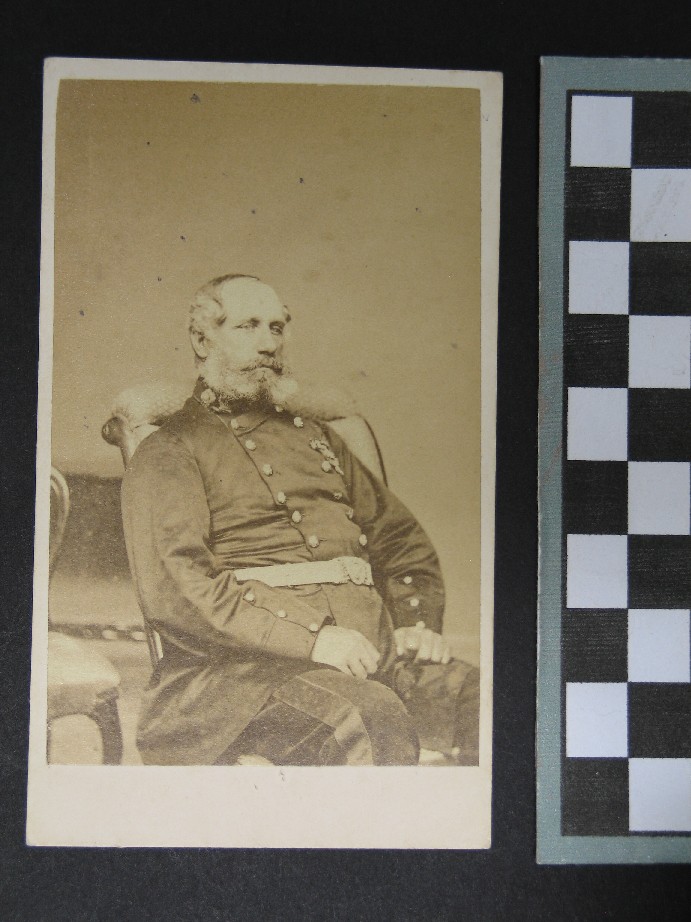 Reference Number1969.0013DescriptionA carte-de-visite of an unidentified man. The image is a studio portrait and shows the man with a moustache and beard, seated in a chair. He is dressed in military uniform, with a white regimental belt. On the back of the carte-de-viste are the photographers details: "PHOTOGRAPHED BY H. WEBSTER - AUCKLAND" and a stamp: "THE ELMS TRUST", and the number 194 written in ballpoint.Physical DescriptionDocumentary Artifact. Carte-de-visitePhotographer/CreatorWEBSTER, H.