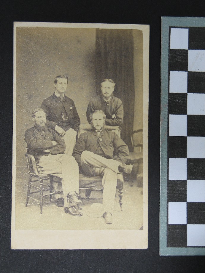 Reference Number1969.0013DescriptionA carte-de-visite of 4 unidentified men. The image is a studio portrait and shows the 4 men who appear to be 20-35 years old, 2 are seated and 2 standing behind them in an informal pose. On the back of the carte-de-viste are the photographer's details: "PHOTOGRAPHED BY H. WEBSTER - QUEEN STREET, AUCKLAND" and a stamp: "THE ELMS TRUST", and the number 196 written in ballpoint.Physical DescriptionDocumentary Artifact. Carte-de-visitePhotographer/CreatorWEBSTER, H.