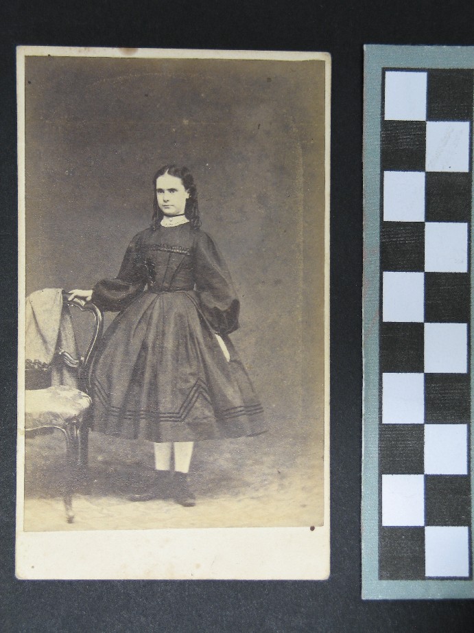 Reference Number1969.0013DescriptionA carte-de-visite of an unidentified girl. The image is a studio portrait and shows the woman standing beside an upholstered chair. She is wearing a gown with a full crinoline, that finishes mid calf, white stockings and boots. On the back of the carte-de-viste are the photographer's details: "PHOTOGRAPHED BY H. WEBSTER - AUCKLAND" and a stamp: "THE ELMS TRUST", and the number 208 written in ballpoint.. Noted with file: These 2 photographs are of the same young woman.Physical DescriptionDocumentary Artifact. Carte-de-visitePhotographer/CreatorWEBSTER, H.