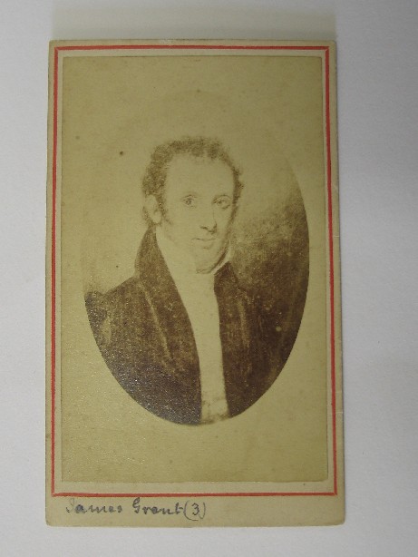 Reference Number2005.0627DescriptionCarte-de-visite of James Grant III. The photograph is of a painting of a man head and shoulders, with short curly hair and sideboards, and a dark jacket with a shawl collar. On the back of the photograph is written in pencil: "Taken from an oil painting of James Grant (3) grandson of "Culloden"James Grant, James Grant (3) sent the painting home to Scotland as a present to James Johnston and his wife Euphemia & her Mother Barbara Dougall nee Grant."Physical DescriptionDocumentary Artifact. Carte-de-visite