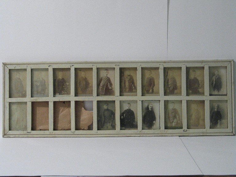 Datec. Early 1900'sReference Number2006.0768DescriptionBlack and white photographs of Barnardo's children in a wooden frame painted cream. There are 20 photographs in the frame and each is covered with an independent sheet of glass. The children are all boys, ranging in age from around 8 years to their early teens. All are dressed in costume from the turn of the 19th century, and are all standing in a similar pose, suggesting the photographs were taken by the same photographer. Found 03/03/2009, 2 carte-de-visites, 2 backing boards, and 2 pieces of glass that appear to belong to this picture. At the time of cataloguing there were missing glass pieces. The carte-de-visites have been numbered with part numbers, 2006.0768.1.a and b, and stored in Archival Box 31. The 2 glasses wrapped in tissue and numbered and stored with picture glass.. Alice and Euphemia Maxwell worked to raise money for Barnados for many years. Alice from her childhood through to her old age. An annual gathering was held at The Elms to raise funds and as the years passed these became large events, overflowing from the house to two large marquees on the lawn. See copy of The Open Door Magazine dated July 1945, in object file folder under this accession number.Physical DescriptionArt. Picture
