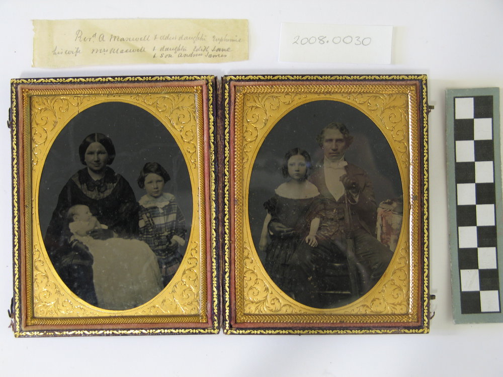Reference Number2008.003DescriptionA daguerreotype set in a case with a lid, made of wood covered with a fine dark brown leather. The case opens like a book and has 2 metal hooks on the side to close. Inside the case are 2 daguerreotypes, one on each side, both mounted under a gold metal surround with an oval opening, set under glass, and an ornately decorated fine gold coloured metal frame around the edge of this on top of the glass. The images are studio portraits, the one on the right proper is Euphemia Ballinghall Maxwell holding her baby daughter Edith Jane in her arms, with her eldest son, Andrew James Maxwell standing on her left. On the left proper side the image is of Andrew Maxwell and his eldest daughter Euphemia. Inside the case is a note with: "Revd. A. Maxwell & eldest daughter Euphemia - his wife Mrs. Maxwell & daughter Edith Jane & son Andrew James".Physical DescriptionDocumentary Artifact. Daguerreotype