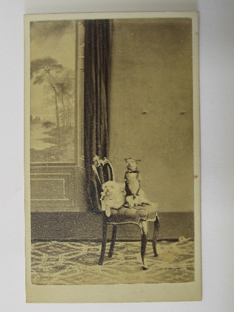 Reference Number2008.0391DescriptionCarte-de-visite of two dogs on a chair. The photograph appears to be a studio portrait, however there are no details on the back of the carte-de-visite.. The carte-de visite was in with photos of the Johnston family relatives.Physical DescriptionDocumentary Artifact. Carte-de-visite