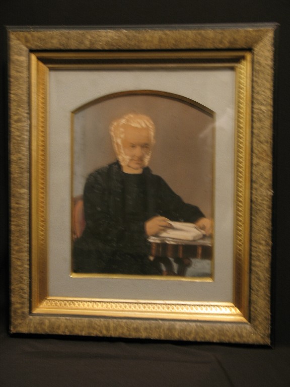 Reference Number1935.0016DescriptionA tinted and framed copy of a photograph of Archdeacon Brown. The copy shows Brown sitting at a table with an open book, and is under glass in a gilt and imitation marble frame. On the cardboard backing of the picture is written in ballpoint: "This picture cleaned and remounted by Harrison's Gallery Tga 3.5.89 $7". The picture is hung with two metal rings one on each side of the frame. During cleaning the orignal hanging mechanism was removed as it did not appear safe, and it was replaced with screw in metal eyelets. The hanging mechanism along with the original nails holding the picture backing in place were removed and placed in a bag in Box 1 in the office. On the back of the photograph is stamped: "Universal Copying Co. - 1436 & 1438 Market Street, between 8th and 9th San Francisco CAL."Physical DescriptionArt. Picture