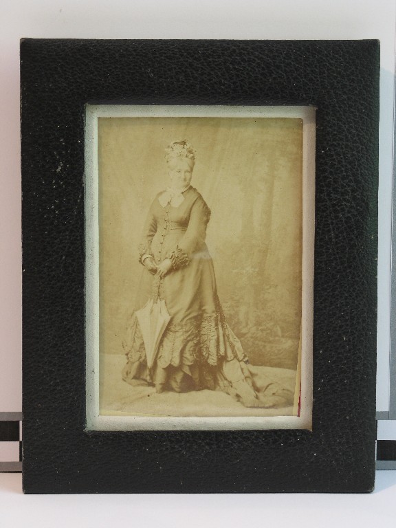 Reference Number2005.0587DescriptionPhotograph of Euphemia Ballingall Maxwell in a black frame. The photograph is black and white, and mounted on card, a studio portrait which shows Euphemia standing full length. On the back of the photograph are printed the details of the photographer. The frame is a black leather frame, and the photo is under glass.Physical DescriptionArt. Picture. Black leather covered, glazed frame.Photographer/CreatorWigglesworth & Binns