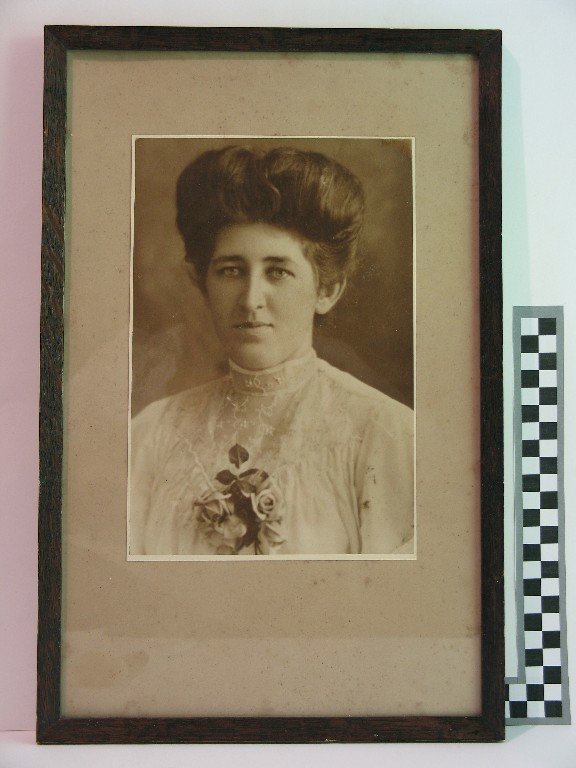 Reference Number2005.0643DescriptionBlack and white photograph of an unknown woman in a plain black wooden frame, under glass. The photograph has been pasted onto a cardboard backing.Physical DescriptionArt. Picture