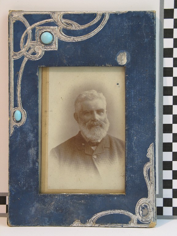 Photograph of an unknown bearded man in a blue art nouveau style frame.