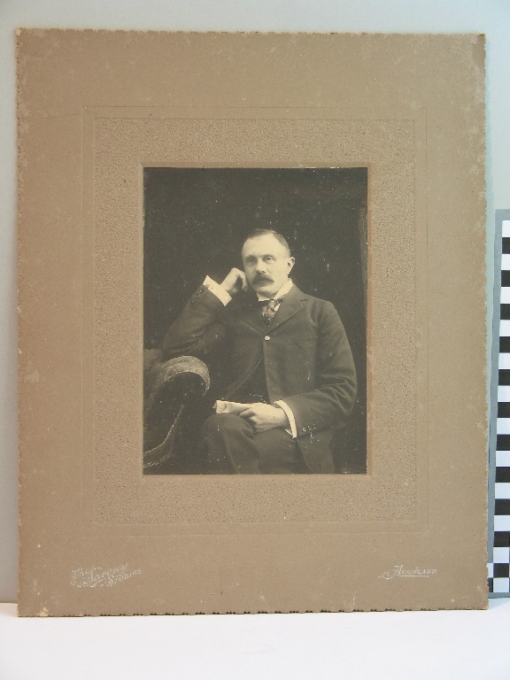 Date1900Reference Number2005.0661DescriptionA black and white photograph mounted on brown card of a seated man in a suit. Written in the top left corner of the photo is: "Ranfurly - 11.9.1900".Physical DescriptionDocumentary Artifact. Print, PhotographicPhotographer/CreatorThe Sarony Studios