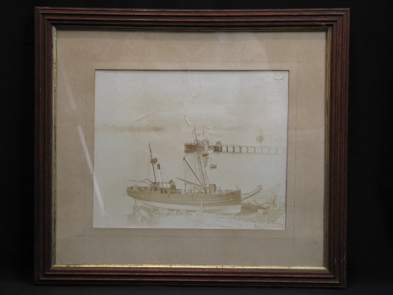 Reference Number2006.0198DescriptionPhotograph of Joseph Brain's boatyard, under glass, in a wood and gilt frame. The photograph shows a double masted ship with a steam funnel pulled up on dry dock in the yard. The photograph is glued onto an acidic backing board, and this and the dampness from flood damage is probably the reason for its poor condition. The matboard is also acidic card.Physical DescriptionArt. PicturePhotographer/CreatorUnknown
