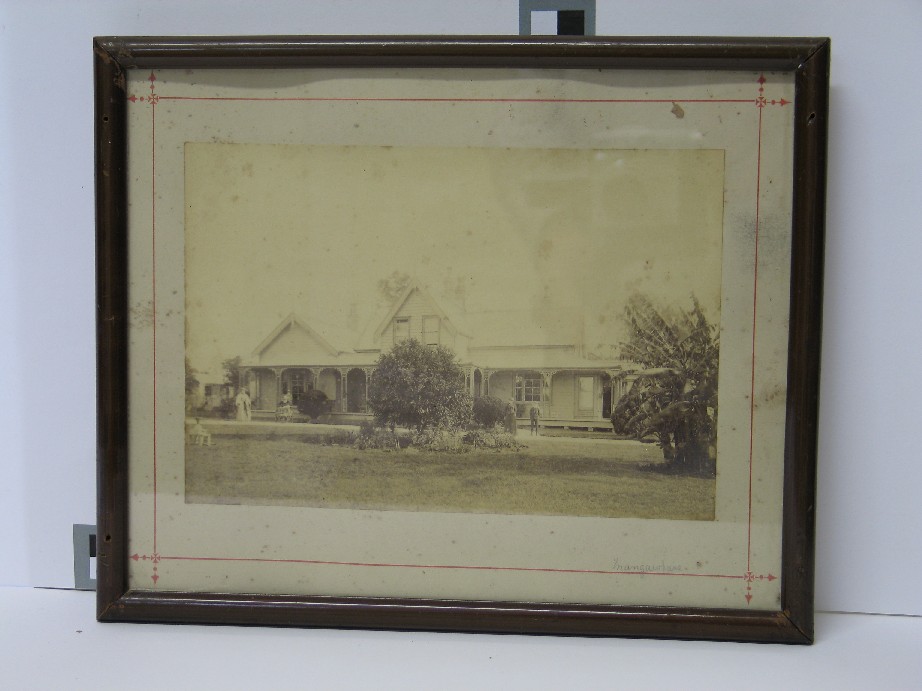 Reference Number2006.0895DescriptionPhotograph of a two storied weatherboard house with verandah, glazed and in a plain wooden frame. The photograph is adhered to a white paper backing with a fine red line border decoration. Written in pencil in the lower left proper corner on this line is: 'Mangawhare'. 06/04/2010: Found an article cut from the Bay of Plenty Times dated March 25, 1986, titled: "House on the Hill - is old city landmark". The article talked about the house shown in this photograph, built in Tauranga, in 1878 and originally named Woodhill, it was renamed Maungawhare, or house on the hill, when sold by the owner Henry Brabant, to his brother H.W. Brabant. For further information see article in Object Information File under this catalogue number.Physical DescriptionArt. Picture